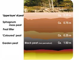 The intermediate layer between the white peat and the black peat is called ‘grey’ peat. The growth or ‘upper’ layer forms the profile’s top layer.